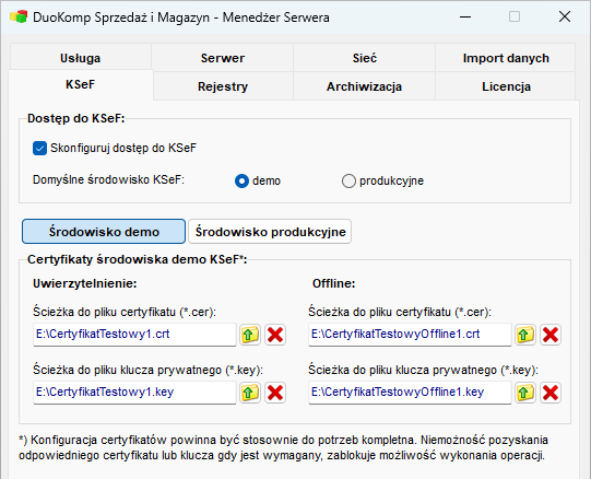 Posiadając już certyfikaty należy je udostępnić programowi. Jest to możliwe w Menedżerze Serwera na karcie KSeF. Po zaznaczeniu pola Skonfiguruj dostęp do KSeF korzystanie z niego stanie się formalnie możliwe na stanowiskach roboczych. Oprócz tego konieczne jest jednak podanie lokalnych ścieżek do wszystkich tych plików z certyfikatami i kluczami, które będą potrzebne do wykonywania operacji przez użytkowników na stanowiskach roboczych (zrzut nr 3). Założenie jest więc takie, że pliki te składowane sa na serwerze lub innej lokalizacji dostępnej dla niego w systemie plików.