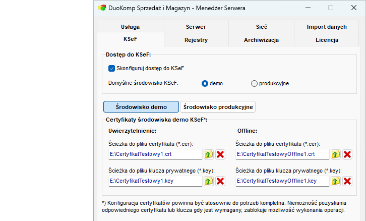 - karta KSeF w Menedżerze Serwera, na której można ustawić korzystanie z KSeF jako udostępnione na poziomie programu oraz podać ścieżki do certyfikatów i kluczy umieszczonych lokalnie na tym serwerze (zrzut nr 4).