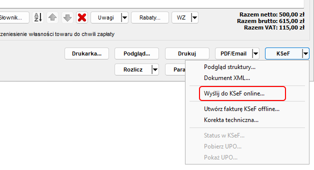 Rozdział 3.3.3.Stanowiska robocze » Krajowy System e-Faktur (KSeF) » OPERACJE KSEF NA FAKTURACH