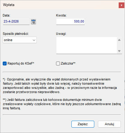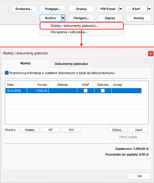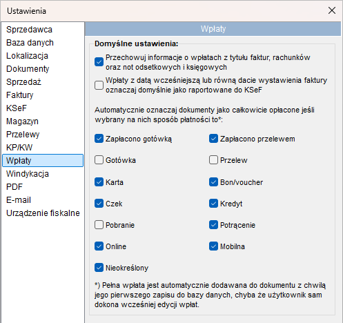 Program umożliwia zapisywanie wraz z dokumentami fakturowymi (za wyjątkiem noty korygującej i zestawienia sprzedaży bezfakturowej) oraz notami odsetkowymi i księgowymi informacji o wpłatach dokonanych z tytułu tych dokumentów. Jeżeli dla danego dokumentu włączona jest opcja przechowywania informacji o wpłatach, wówczas na listach wystawionych dokumentów może pojawić się informacja o aktualnym statusie ich rozliczenia z kontrahentem. Dodatkowo, pod warunkiem zaznaczenia odpowiedniej opcji, informacja o wpłatach może być przekazywana do faktury KSeF.