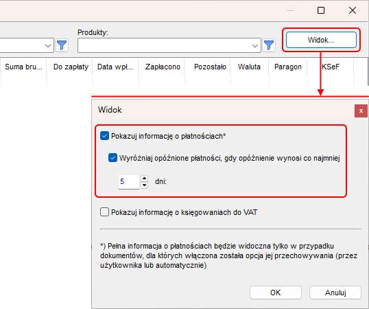 Dodatkowo, dokumenty które pod względem płatności są już "przeterminowane", mogą być podświetlane na czerwono.