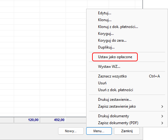 Listy wystawionych dokumentów udostępniają również opcję Ustaw jako opłacone dostępną w menu odpowiednich okien (zrzut nr 5). Działa ona w ten sposób, że zaznaczonym na liście dokumentom (w dowolnej ilości jednocześnie) zostanie przypisana pełna brakująca wpłata. Jeśli zaznaczony dokument nie miał włączonej opcji przechowywania informacji o płatnościach, zostanie ona włączona.