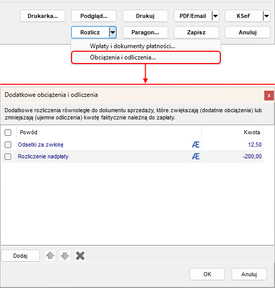 Dokumenty typu fakturowego (za wyjątkiem noty korygującej i zestawienia sprzedaży bezfakturowej) mogą zawierać dodatkowe rozliczenia: dodatnie obciążenia oraz ujemne odliczenia. Odpowiednia opcja dostępna jest w oknie edycji faktury pod przyciskiem Rozlicz (zrzut nr 6).Odpowiednio zwiększają i zmniejszają one kwotę do zapłaty, nie wpływając jednak na kwotę formalnie należną z dokumentu.
