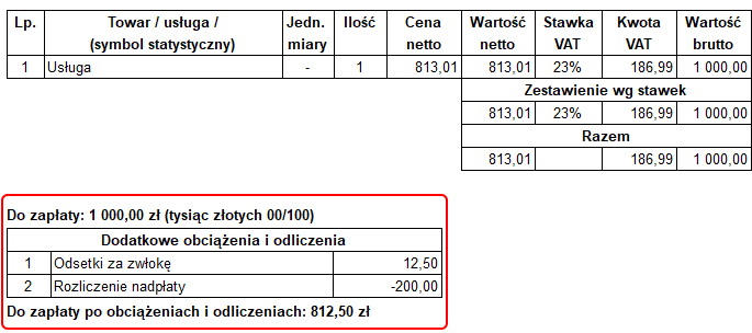 Typowym przypadkiem obciążenia mogą być mp. odsetki za zwłokę z tytułu wcześniejszych opóźnień w płatnościach. Przykładem odliczenia może być natomiast wcześniejsza nadpłata z tytułu innego dokumentu sprzedaży.