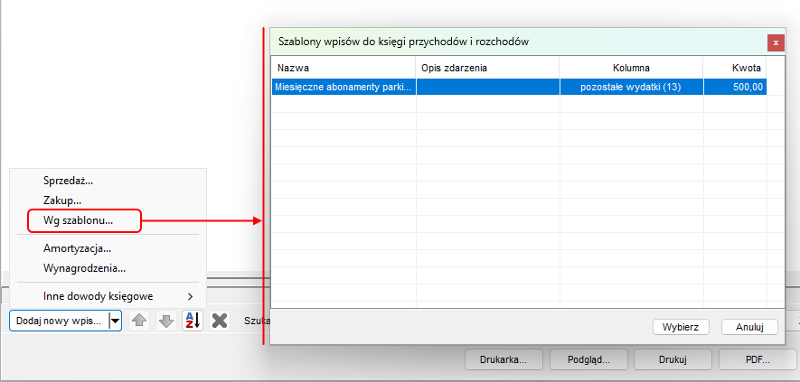 Szablony można wykorzystać z poziomu okna edycji pkpir lub ewidencji ryczałtu w następujący sposób: