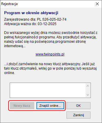 Dlatego równolegle do istniejących rozwiązań dodaliśmy możliwość pobrania klucza aktywacyjnego online. Nowa możliwość jest dostępna dla użytkowników, którzy mają już wcześniejszy klucz i jest on prawidłowo wprowadzony do działającej kopii programu. W praktyce chodzi więc o odnowienie wygasającej aktywacji w już używanym programie.