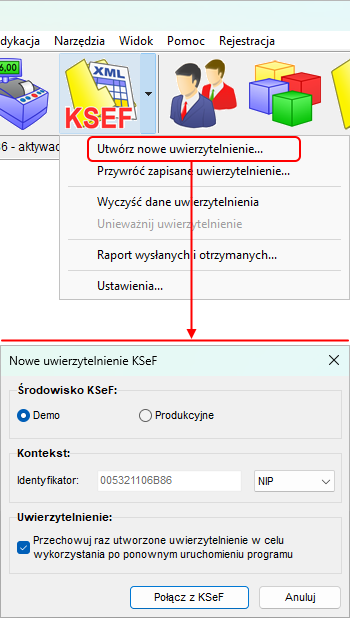 Aby po raz pierwszy uwierzytelnić się w KSeF, należy w menu głównym lub pasku narzędzi okna głównego wybrać opcję KSeF → Utwórz nowe uwierzytelnienie. Spowoduje to wyświetlenie okna z dostępnymi opcjami uwierzytelnienia (zrzut nr 4).