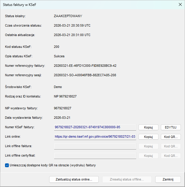 Faktura zaakceptowana w KSeF otrzymuje numer KSeF oraz możliwe staje się wygenerowanie linku oraz kodu QR do niej. Link i kod można znaleźć w oknie Status w KSeF oraz na wydruku / PDF faktury, o czym niżej.