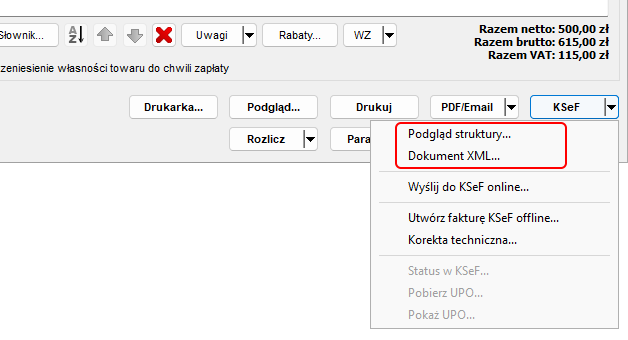 Menu KSeF faktury zawiera dwie opcje podglądu treści struktury KSeF. Nie są to same w sobie żadne rzeczywiste operacje na KSeF, jednak są z tego punktu widzenia bardzo istotne. W razie potrzeby pokazują bowiem użytkownikowi jaka struktura zostanie lub już została przekazana do KSeF.