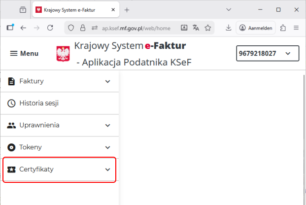 Logowanie do Aplikacji podatnika KSeF na jej stronie internetowej możliwe jest przez szeroki wachlarz dostępnych w Polsce metod autoryzacji do usług publicznych, w tym m.in. przez bankowość elektroniczną oraz mObywatel. Po zalogowaniu zarządzanie certyfikatami dostępne jest w menu Certyfikaty (zrzut nr 1).
