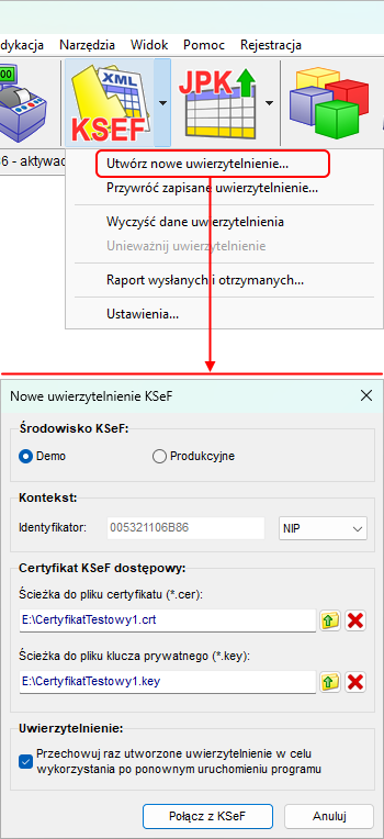 Program łączy się z KSeF korzystając z certyfikatów KSeF. Użytkownik może je utworzyć samodzielnie na stronie internetowej KSeF (Aplikacja podatnika KSeF).