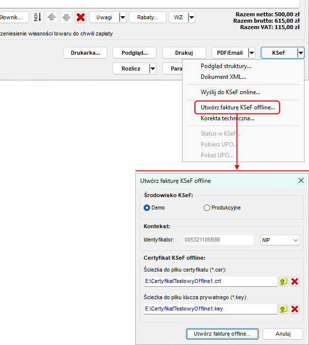 W sytuacjach przewidzianych prawem, zwłaszcza gdy użytkownik nie może połączyć się z KSeF z powodu braku dostępu do internetu lub awarii samego KSeF, istnieje możliwość wystawienia faktury offline. W tym celu niezbędny jest certyfikat offline (odrębny od certyfikatu uwierzytelniającego) oraz hasło do powiązanego z nim klucza prywatnego.