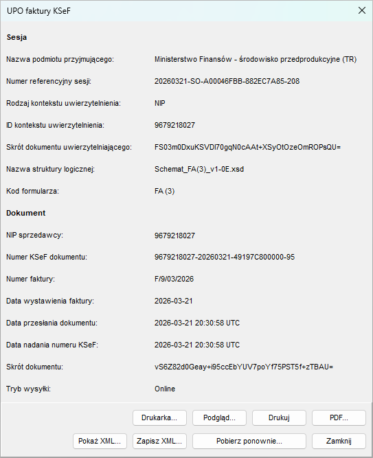 Wszystkie szczegóły UPO dla danej faktury można zobaczyć w oknie wyświetlanym po kliknięciu opcji UPO w menu KSeF faktury (zrzut nr 4). Dostępne są tam również opcje jego zapisu na dysk w oryginalnej postaci (XML) oraz wydrukowania go lub zapisania do PDF w formie raportowej.